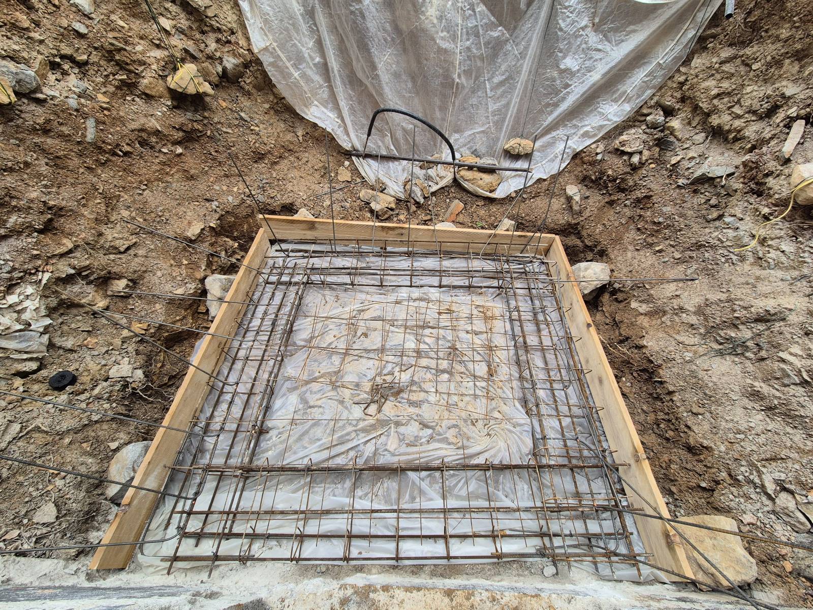 Les fondations béton armé ont été coulées après réglage précis des niveaux. Le ferraillage a été mis en place avant le coulage - armatures filantes, cadres, et surtout les premiers tors en attente qui sortiront en tête de fondations pour ancrer la dalle au-dessus.