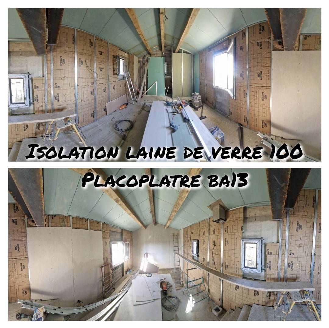La laine de verre 100 mm a été insérée entre les montants. L’isolant assure la performance thermique et phonique. Pose continue. Aucun espace vide. Isolation homogène sur l’ensemble des parois.