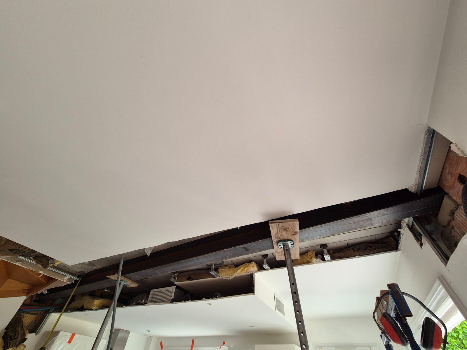Ouverture du plafond pour accéder à la structure existante. Mise en place de deux IPN acier. Réglage précis. Les poutres reprennent la charge du plancher. Niveau rétabli. Affaissement stoppé. Bonne tenue.