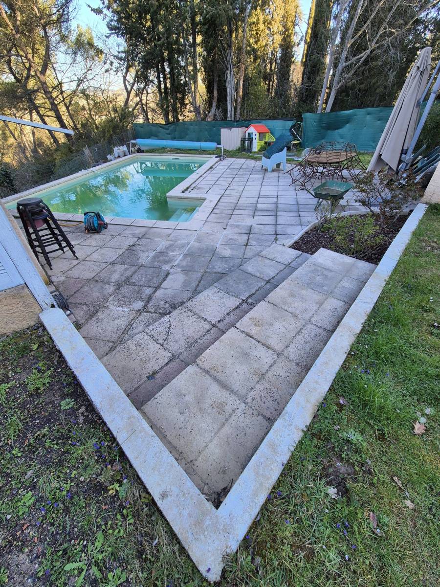 Nous avons réalisé la démolition des anciennes dalles et margelles. L’évacuation a libéré un support sain.