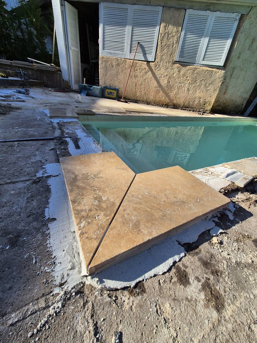 Nous sommes intervenus à Meyreuil (13) pour la rénovation complète d’un contour de piscine. Ce chantier regroupe démolition, pose de margelles en travertin, réalisation d’une chape en ciment avec pente et pose de carrelage en travertin 40×60 avec protection.