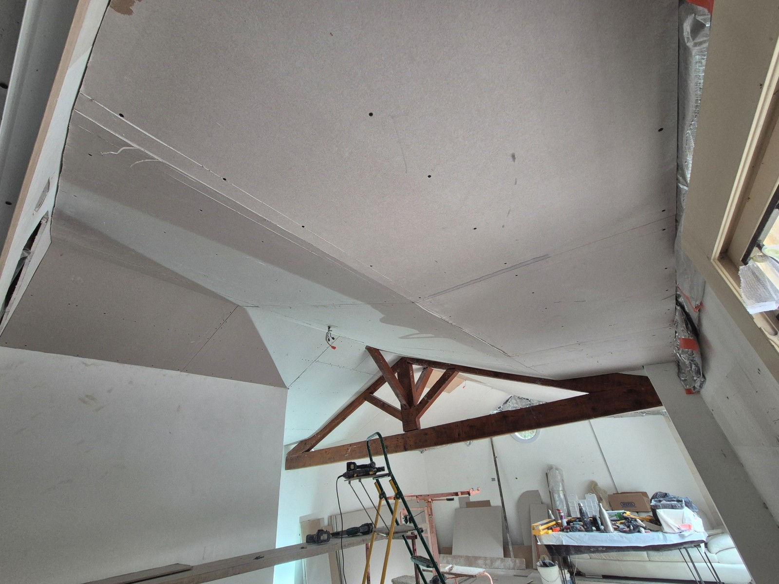Les plaques de BA13 ont été mises en pose sur l’ossature métallique. Les joints ont été traités pour obtenir une surface plane. Le plafond est maintenant prêt pour la finition.