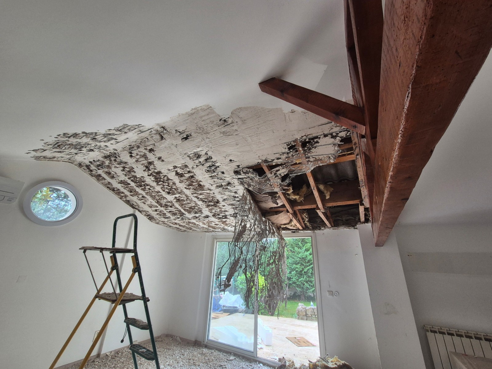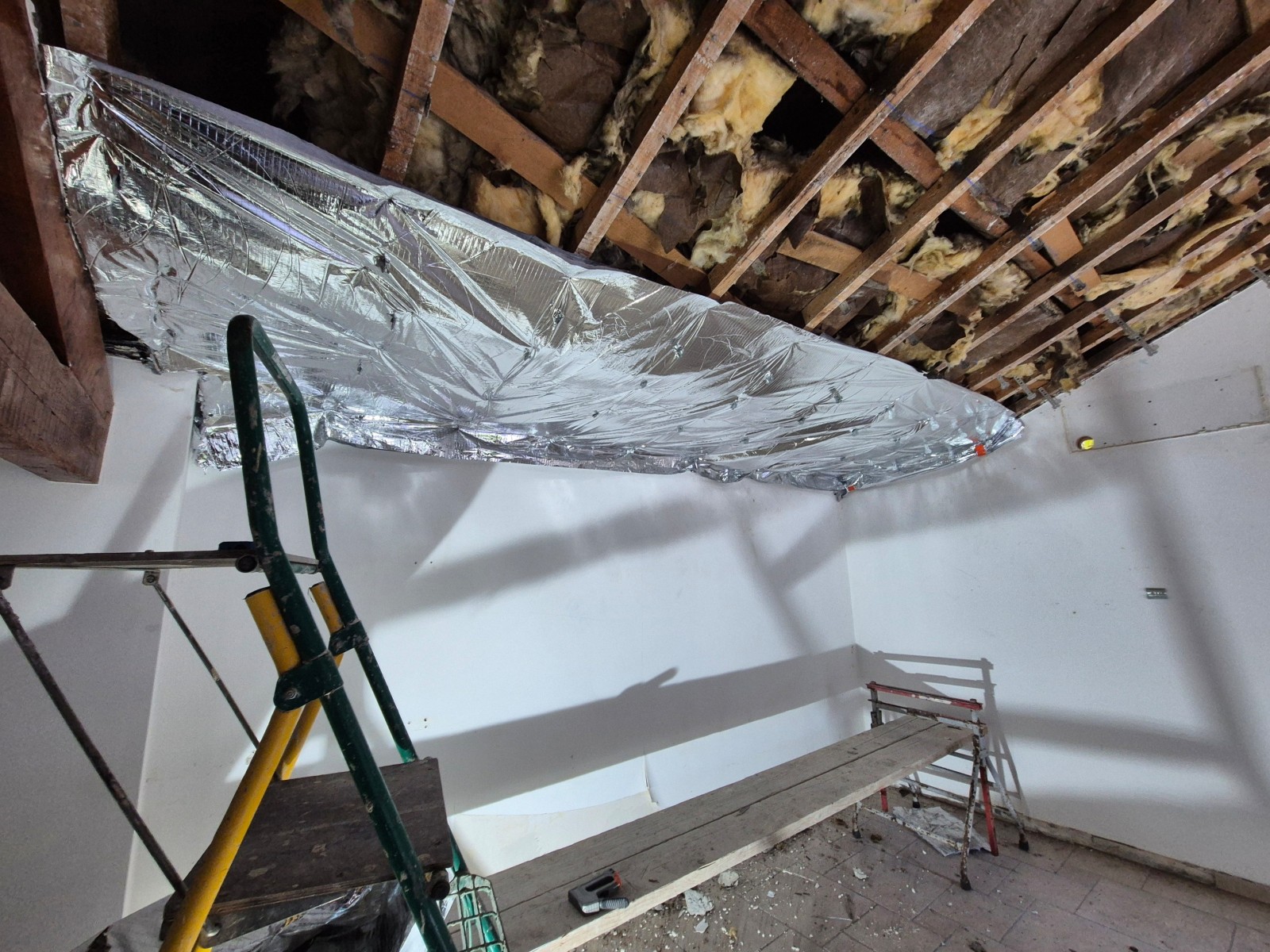 L’ancien faux plafond en plâtre et Nergalto a été retiré. La démolition a permis de supprimer une structure dégradée et un isolant inefficace. Les gravats ont ensuite été évacués.