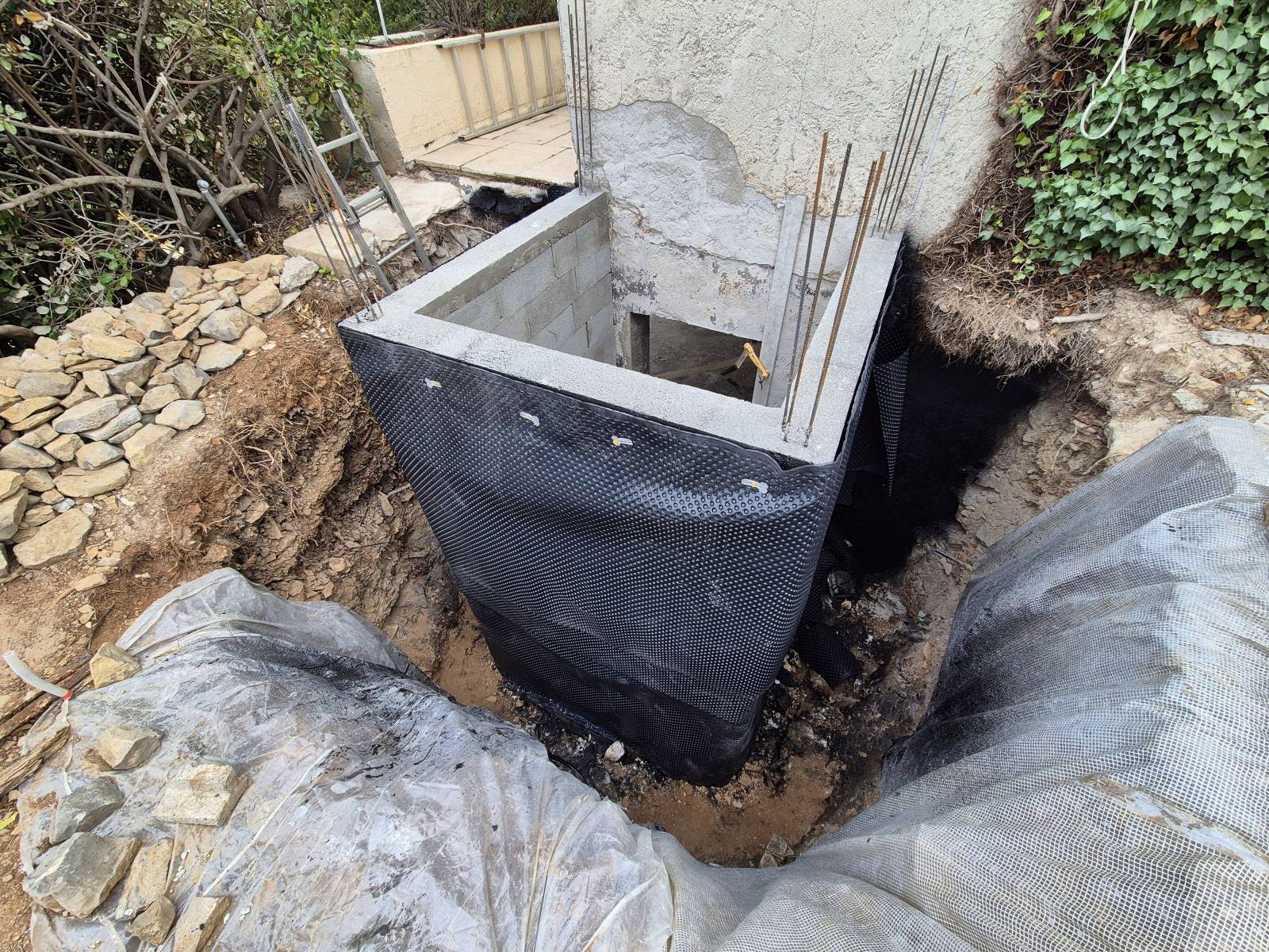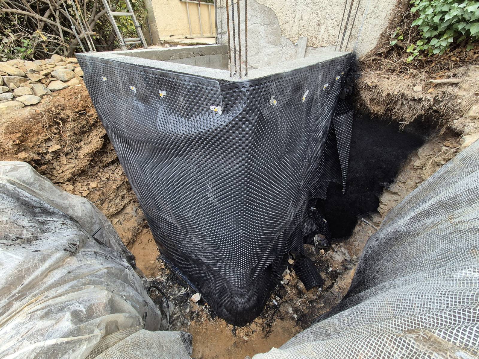 Une membrane drainante a été posée autour de la structure, contre les parois imperméabilisées. Son rôle est complémentaire à l'enduit - là où l'imperméabilisant bloque l'eau au niveau du mur, la membrane drainante évacue l'eau loin de la structure avant qu'elle ne génère une pression hydrostatique contre les parois.