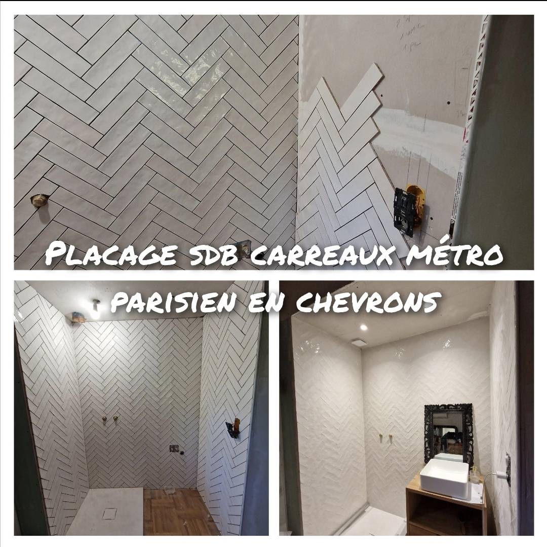 Le carrelage métro blanc a été posé avec une colle adaptée. Disposition en chevrons. Alignement précis. Les joints restent constants. Lecture nette. Rendu lumineux et équilibré.