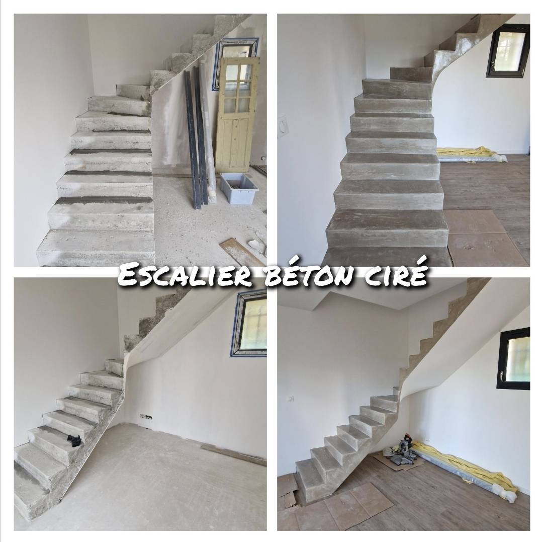 Ce chantier concerne la réalisation complète d’un escalier intérieur en béton armé quart tournant à Rousset, dans les Bouches-du-Rhône. Les travaux ont débuté par le coffrage précis de chaque marche afin de définir une montée régulière et un quart tournant bien calé. Les armatures acier ont ensuite été mises en place et ligaturées pour constituer une structure solide avant le coulage. Le béton a été coulé en une seule opération pour garantir une bonne homogénéité de l’ensemble. Après séchage, une finition en béton ciré gris a été appliquée en deux passes. L’escalier obtenu est stable, lisible et adapté à un usage intérieur quotidien.